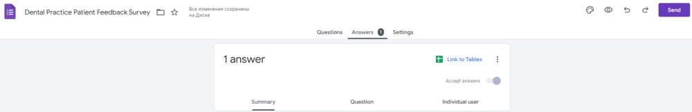 As soon as patients complete the survey, their replies are instantly collected and organised in Google Forms. You may view and analyse the responses in real-time by going to the "Responses" tab in Google Forms.