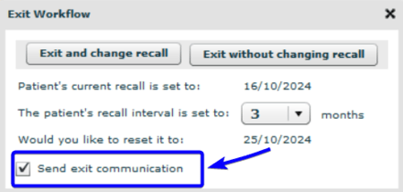 The system sends an email or SMS as ‘Exit communication’ using a preset template.