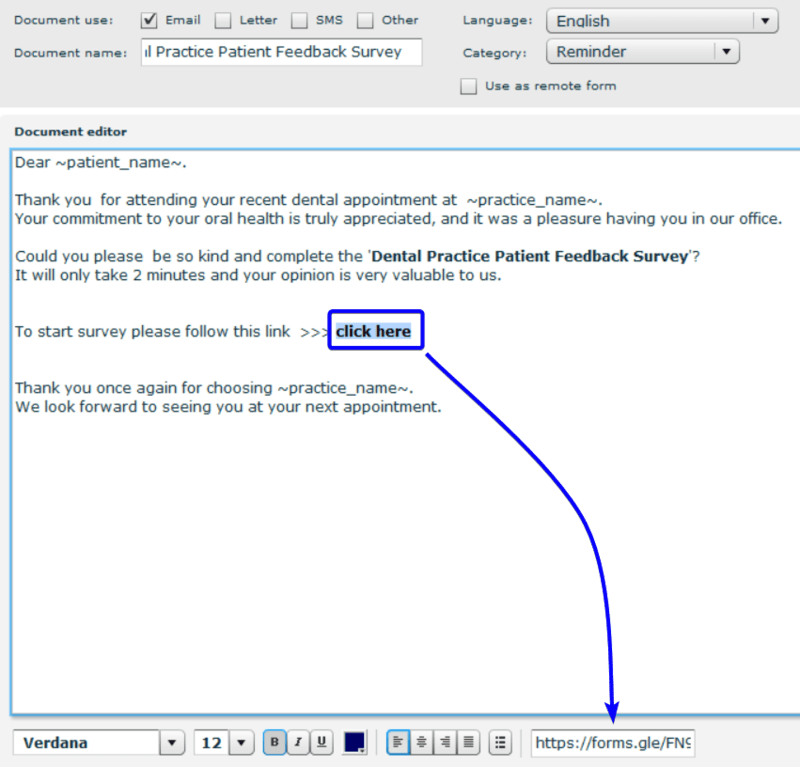 After that, you may share this link with your patients via DentalPlus Communications, Exit Communications, or Bulk Mailing. Simply put it into the document you're sending.