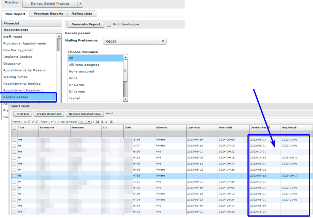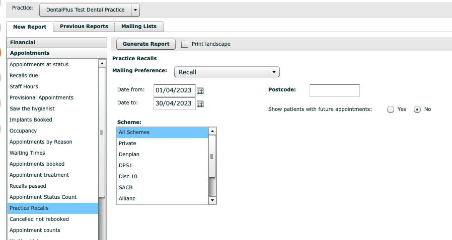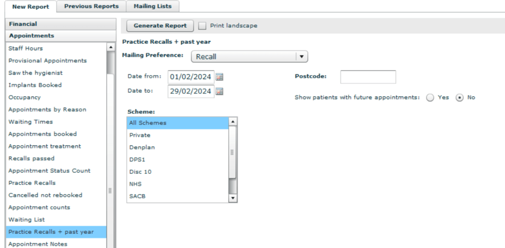 2) The 'Practice Recalls+past year' report displays all patients whose recall date is in the date range, as well as those whose recall date was within the past year and who don't have any future appointments. Also, you can choose a scheme or adjust mailing preferences. It helps to find patients that might have been missed and have an obsolete recall date.