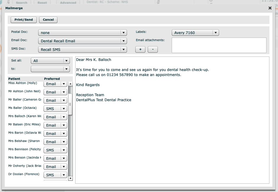When you're ready, click the Print/Send button. All SMS and emails will be addressed directly to the patient. All letters will be directed to your printer.