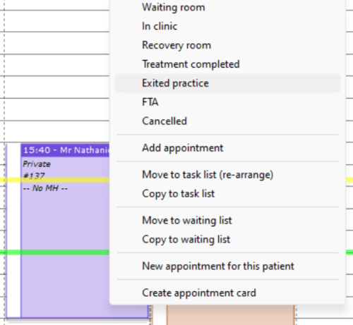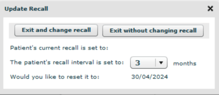 2. After completing treatment, update the appointment status to "Exited Practice" in the Appointment Book and “Update Recall” in the pop-up window