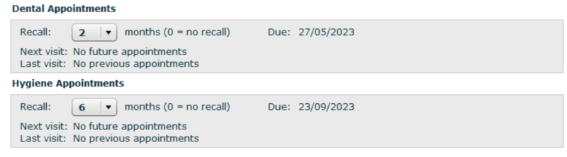 According to the settings below, the patient will be contacted using their preferred contact method via the Practice Recall report in two months for the dentist and three months for the hygienist.