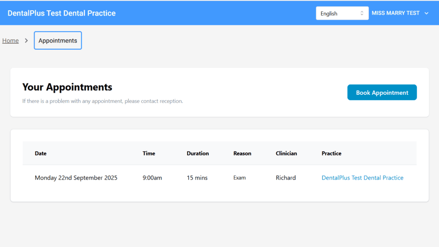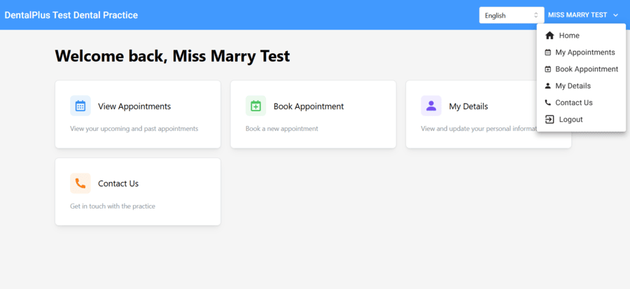Once logged in, patients can view appointments, book new ones, and update their personal details online.