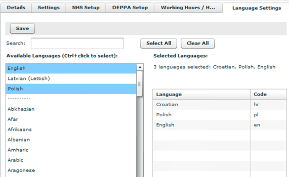 1. In Admin → User Setup → User → Setup → Language Settings, indicate the languages spoken by each dentist.