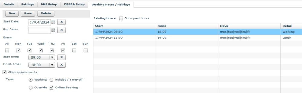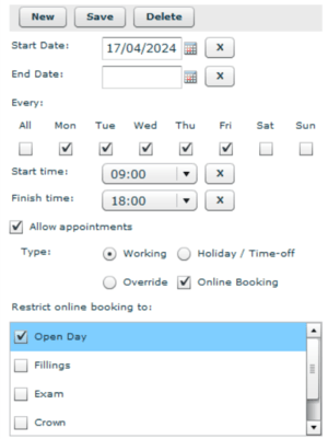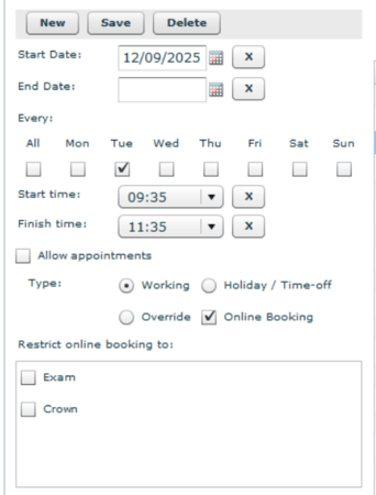 Our next step is dentist availability. We need to make sure the working hours of these dentists are open for online booking. This is managed in: