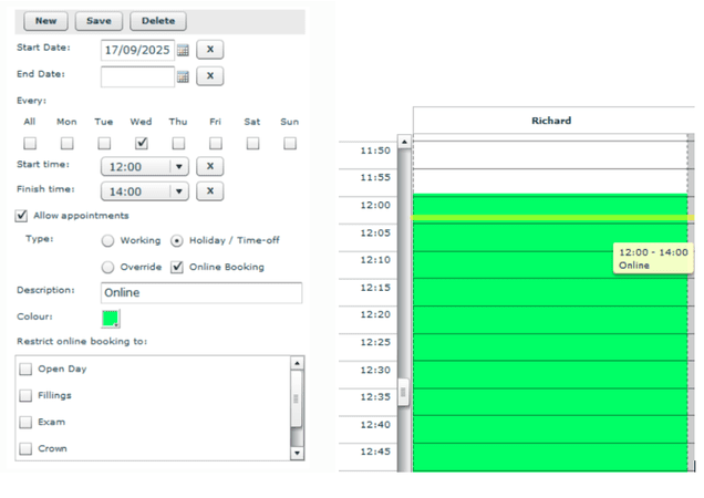 → To highlight a time slot in the appointment book with colour, pick 'Holiday/Time off', provide a description and colour, and ensure that 'Allow appointments' is checked.