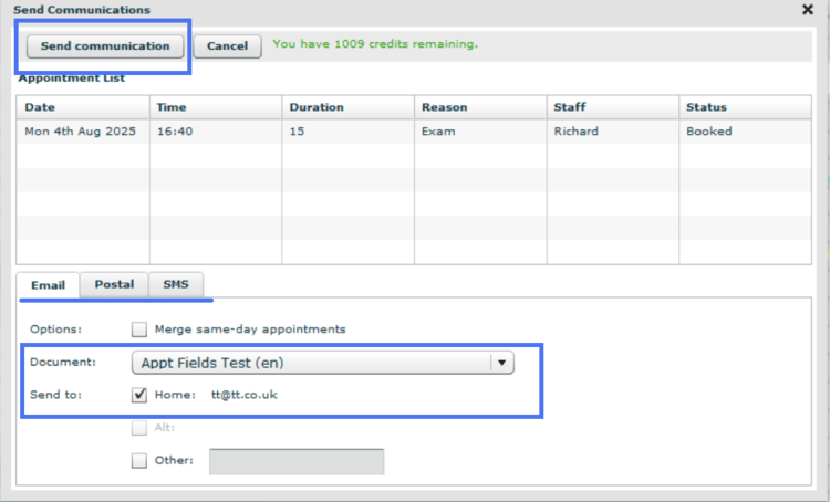 3) There is an option to change documents to be sent in the drop-downs “Email Doc” and “SMS Doc”.