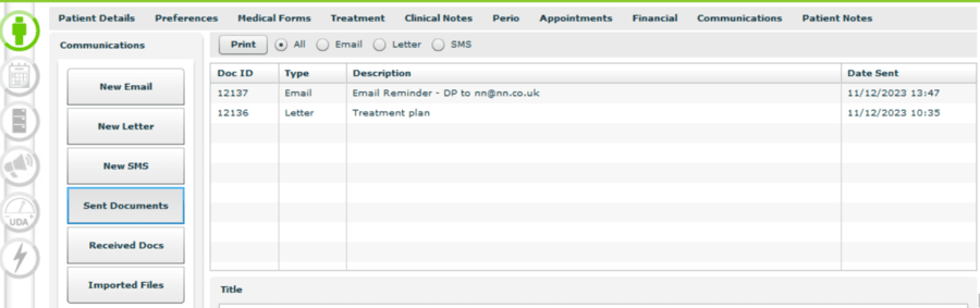 All reminders are stored in the Patient Record → Communications section.