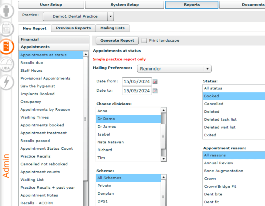 A report shows the patient's appointment details. It has different settings and can be filtered by date, choosing relevant clinicians, schemes, statuses, and appointment reasons.
