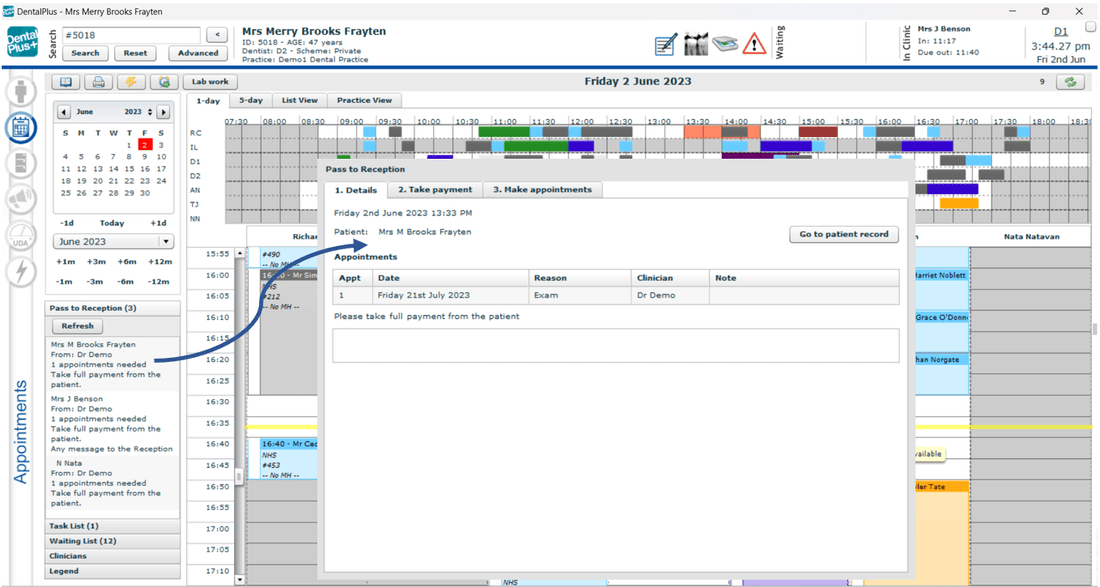 When an appointment is completed, the clinician sends 'Pass to Reception' tasks. The receptionist finishes the essential tasks before the patient departs the surgery. These responsibilities could involve paying, scheduling the next session, or gathering additional information. The receptionist should click on each tab and finish all of the chores before the patient leaves.