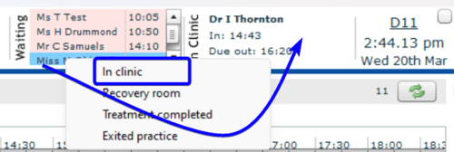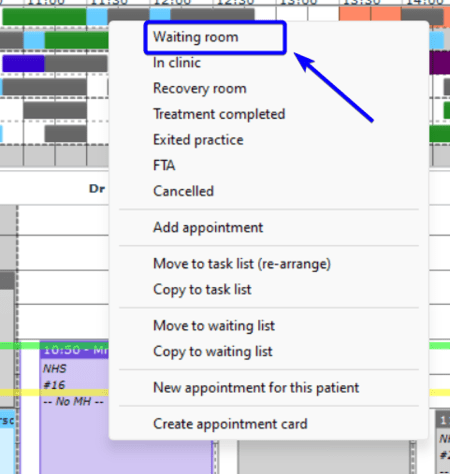 When a patient arrives at the practice for their appointment, you can book them into the Waiting Room.