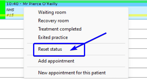 When the appointment is over and a patient is ready to leave the clinic, the appointment status changes to ‘ Exited’ by clicking on the appointment and selecting ‘Exited Practice’ in the context menu. A box will pop up to remind the receptionist to update the Recall interval or send Exit communication
