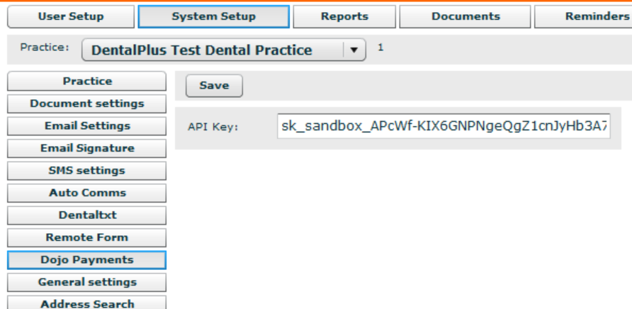 Once you have created your Dojo account, you'll need to generate an API key and copy it to the DentalPlus admin section. Contact the Dojo integration team with your customer reference number and terminal ID to receive an email with your integration details.