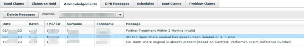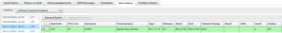 The ‘Sent Claim’ tab contains all claims that were sent earlier. It consists of the data per batch such as ID, Date, patient and clinician name, band, category and count