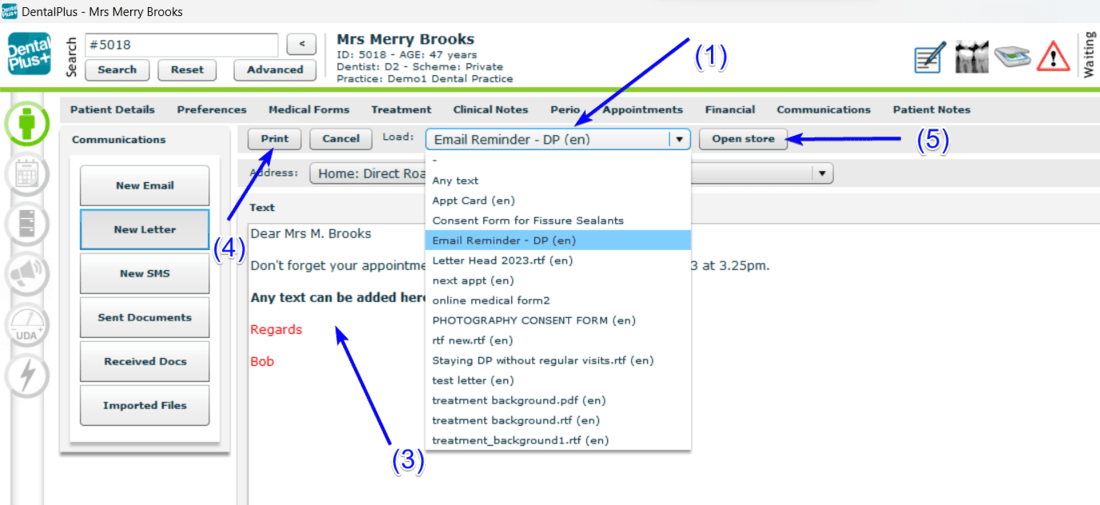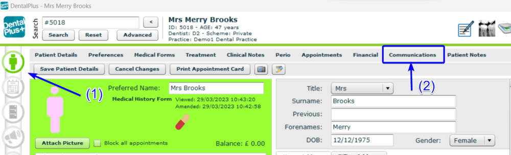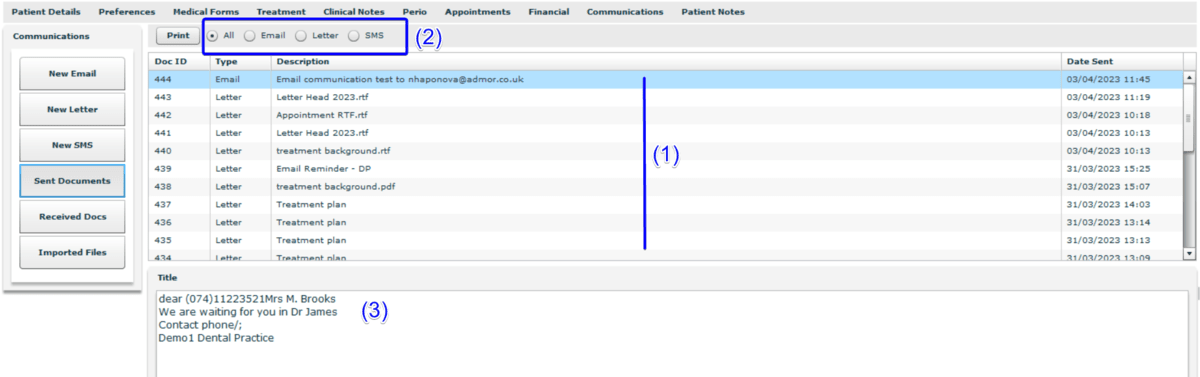 ‘Sent Documents’ functionality contains a list of documents (letters, e-mails, sms) sent through DentalPlus to this patient.