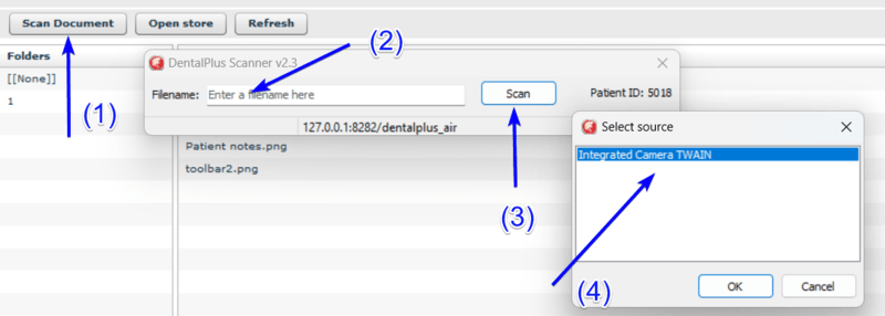 *** DentalPlus can use any Scanning source : scanner, web camera, intra-oral camera. This scanner should be plugged in and set up properly in the Operating System.