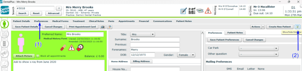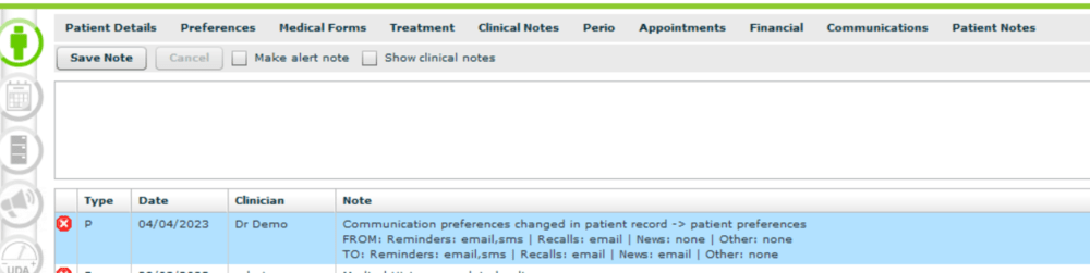 According to the GDPR (General Data Protection Regulation), mailing preferences should be confirmed with the patient to obtain formal consent to send them various notifications and offers. You can manage settings from two tabs : (1) Patient Record →Preferences or (2) Patient Record → Patient Details →Green Arrow Button right on the side.
